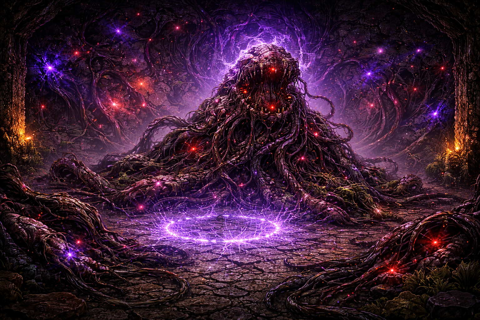 Beyond waits a nightmare: a writhing eldritch mass of tendrils, teeth, and hunger, barely contained within the chamber.
