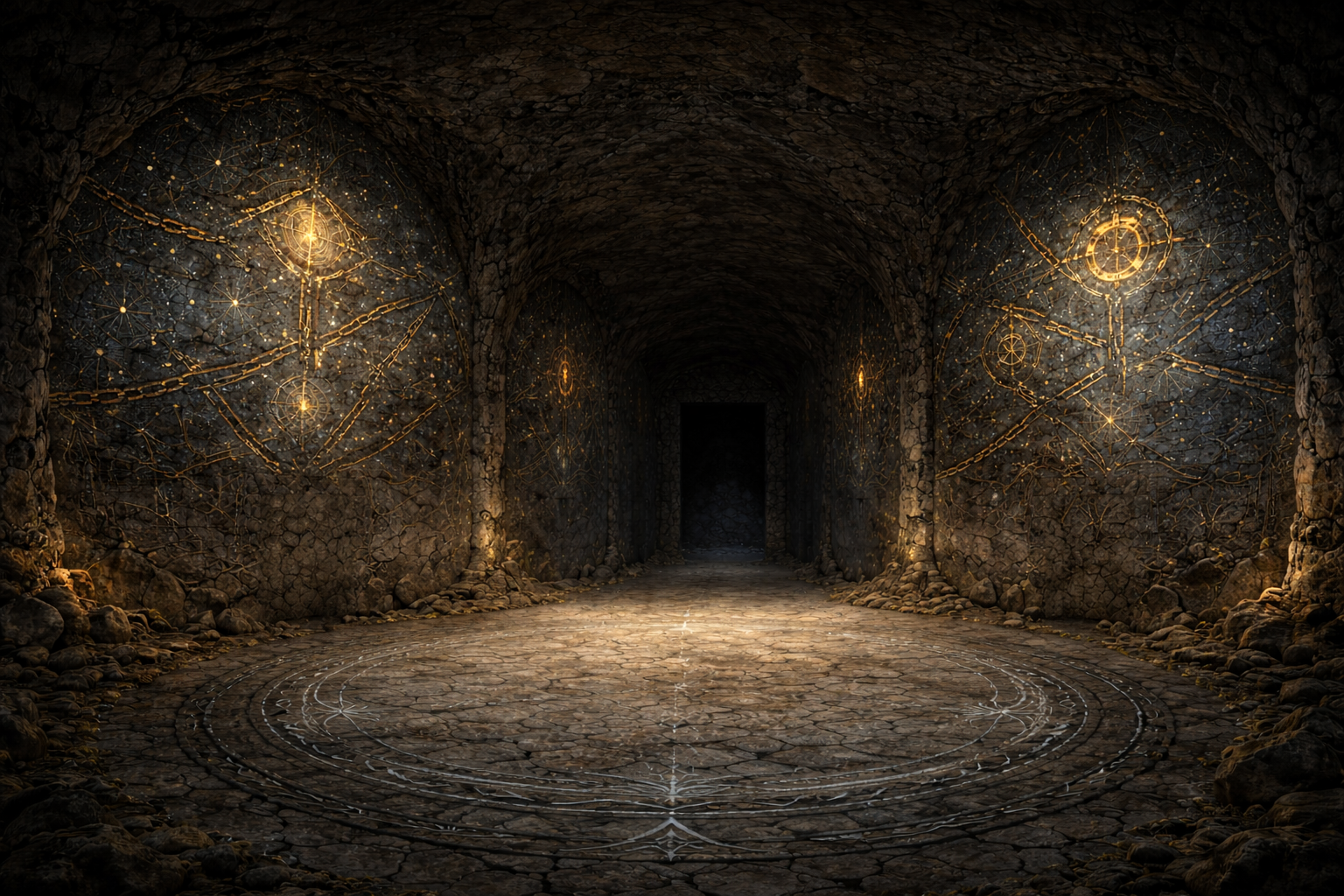 At the bottom lies a circular chamber, untouched for an age. Amber and gold inlay the walls, echoing the glyphs above. A mosaic of stars illuminates three possible paths, each corresponding to symbols carved into nearby doors.